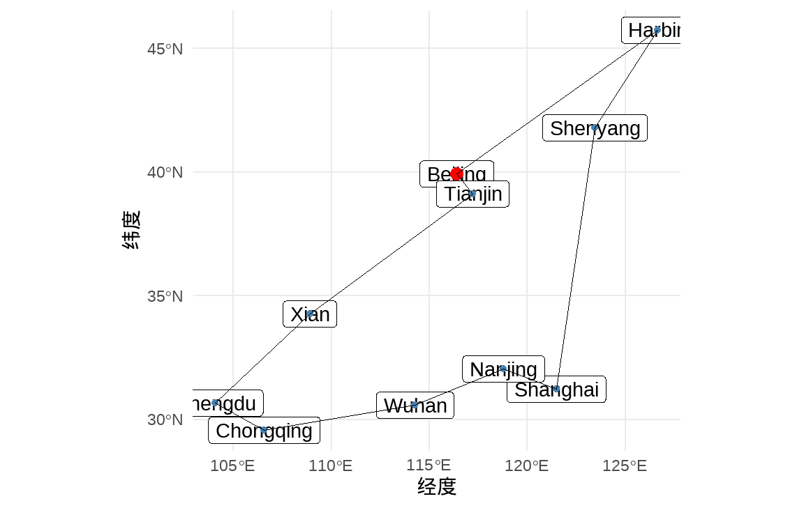labs(x = "经度", y = "纬度")通过sf包的st_distance可以计算城市坐标之间的直线距离