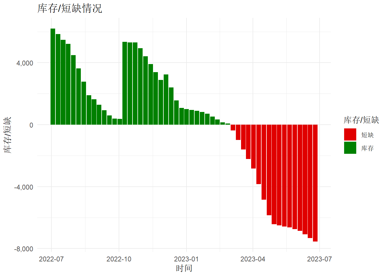 labs(x = "时间", y = "库存/短缺", fill = "库存/短缺", title = "库存/短缺情况") +